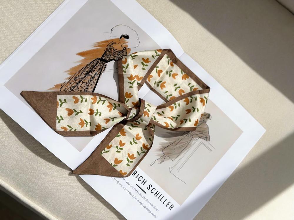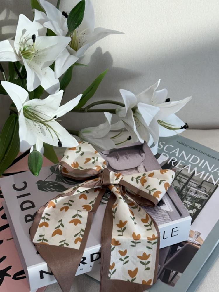 وشاح مزين بزهور التوليب البرتقالية، يرمز للأمل والجمال الذي يزهر حتى في الصحراء.